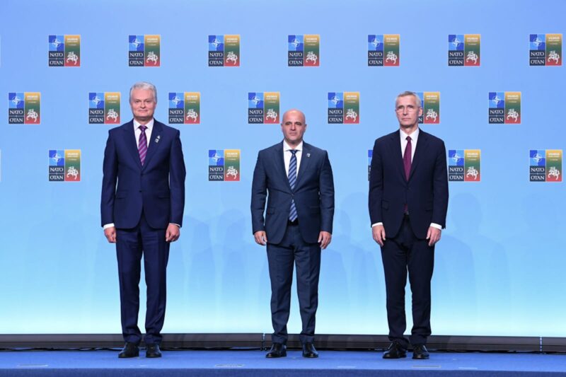 Ковачевски пречекан од литванскиот претседател Науседа и генералниот секретар на НАТО, Столтенберг, на самитот на НАТО