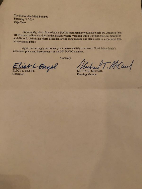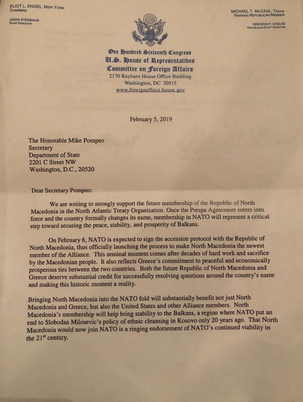 Конгресменот Елиот Ејнџел му го предаде на Османи писмото, со кое тој како претседавач на комитетот за надворешна политика на американскиот Конгрес, заедно со конгресменот Мајкл Меккол, кој е исто така член на комитетот, му се обраќаат директно на државниот секретар Мајкл Помпео, за поддршка на Македонија во нејзините евро-атлантски аспирации, за што во писмото наведуваат дека претставува директен интерес на САД и нејзините сојузници.