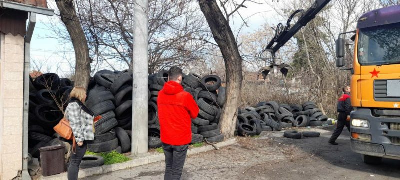 Заедничката акција на градските и општинските инспектори за животна средина на терен се спроведува во општина Центар, во населбата Крњево, каде што со помош на механизација се чисти депонија составена од оштетени автомобилски гуми оставени на приватен незаграден имот, при што подигнати се околу 700 гуми, со што е спречено нивно потенцијално палење и загадување на воздухот и животната средина.