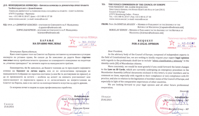 Пратениците на Левица, Димитар Апасиев и Борислав Крмов, испратија писмо до претседателот на Венецијанската комисија, Џани Букикио, во кое се бара правно мислење околу проблематичното прашање за планираното впишување на податоци за „етничка припадност“ во личните карти на македонските граѓани.
