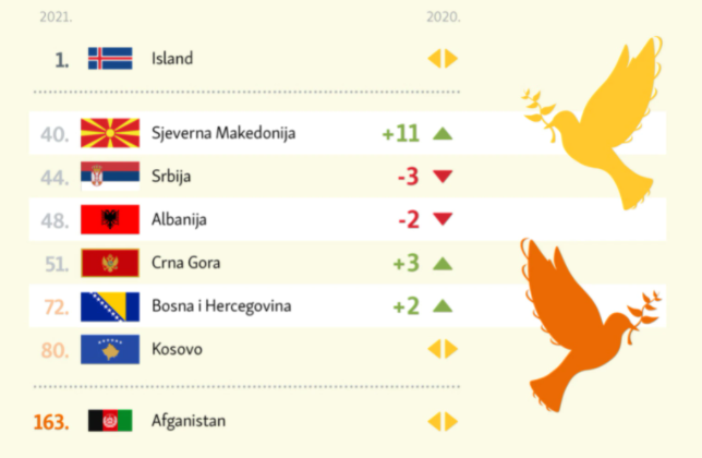 На прво место во светот е Исланд, а на последното 163-то се наоѓа Авганистан.