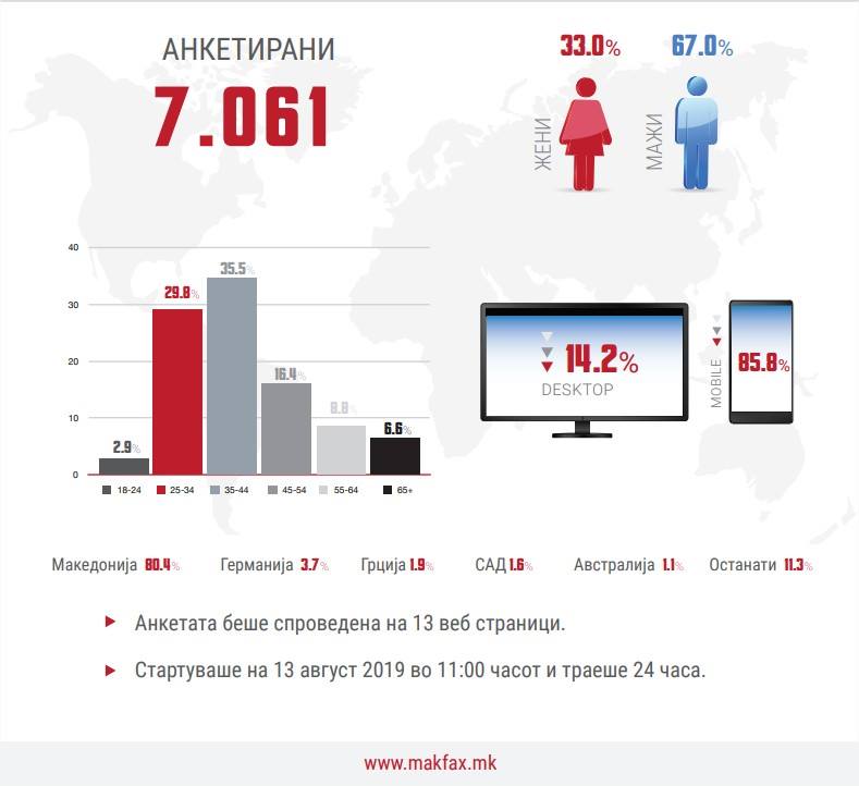 Од вкупно 7.061 анкетирани, според податоците на истражувачкиот центар на „Макфакс“, најголем дел биле мажи на возраст од 35 до 44 години.