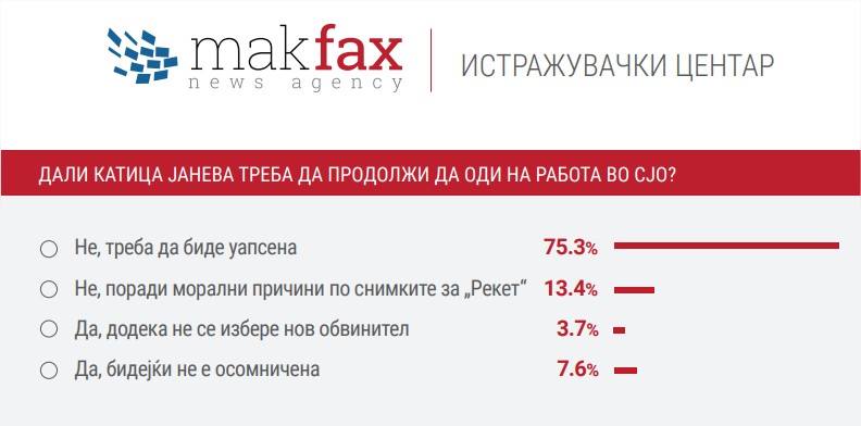 Во онлајн анкетата што ја спроведе истражувачкиот центар на „Макфакс“, на прашањето „Дали Катица Јанева треба да продолжи да оди на работа во СЈО“, над половина, односно 75,3% од анкетираните одговориле со „Не, треба да биде уапсена“.