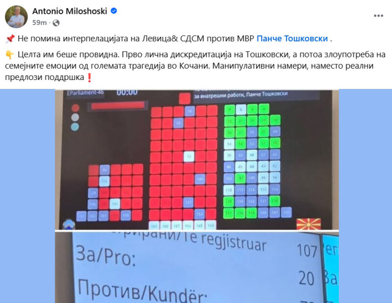 „Не помина интерпелацијата на Левица и СДСМ против МВР, Панче Тошковски. Целта им беше провидна“, напиша на социјалните мрежи Антонио Милошоски.