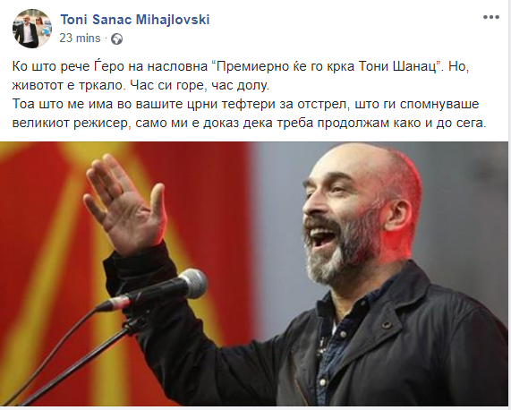 „Ко што рече Ѓеро на насловна ‘Премиерно ќе го крка Тони Шанац’. Но, животот е тркало. Час си горе, час долу. Тоа што ме има во вашите црни тефтери за отстрел, што ги спомнуваше великиот режисер, само ми е доказ дека треба да продолжам како и до сега“, напиша Михајловски на Фејсбук.