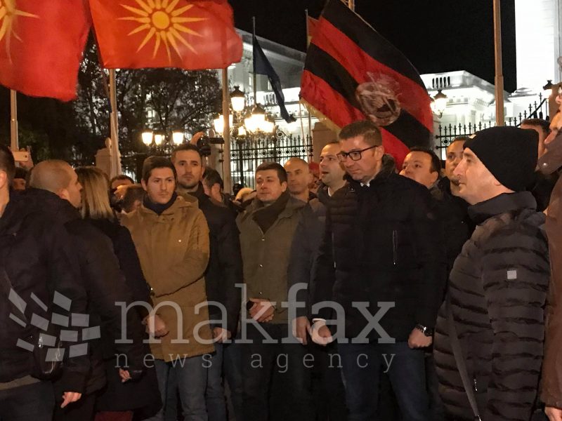 Тој најави дека партијата почнува со активности низ Македонија. „Едно големо ‘уа’ за Зоран Заев. Припадниците на МВР ја чуваат Македонија од тој натрапник, кој се крие некаде внатре. Денеска почнуваме и одиме низ Македонија за викендот. Секоја среда ќе бидеме пред Владата да го изразиме нашиот револт. Тој ќе биде изразен поинаку, со мирни протести. Нема да бидеме како нив, да кршиме и фрламе, бидејќи ние ова го градевме. Ветија ќе ја тргнат оградата, а не ја тргнаа. Што е, се плашите од народот ли?“, рече Мицкоски.