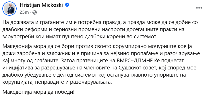 Македониjа мора да се бори против своето корумпирано мочуриште, кое jа држи заробена и заложник и е причина за неjзино пропаѓање и разочарување кај многу од граѓаните. Затоа, пратениците на ВМРО-ДПМНЕ ќе поднесат иницијатива за разрешување на членовите на Судскиот совет, кој, според мое длабоко убедување, е дел од системот што останува главното упориште на корупцијата, неправдите и разочарувањата. Македониjа мора да победи!“, напиша Мицкоски.