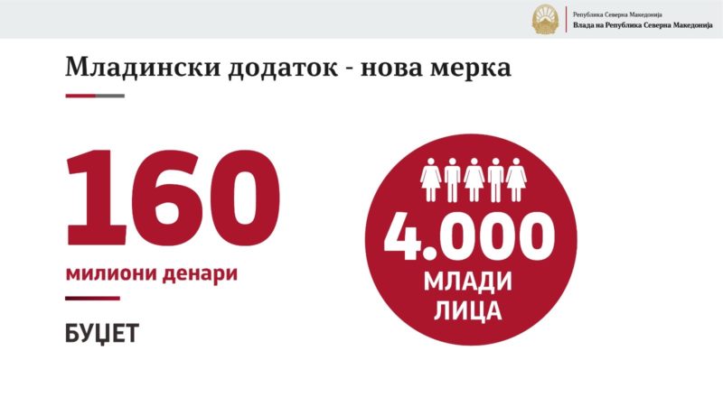 „Со младинскиот додаток ги поттикнуваме младите лица да се вклучат на пазарот на труд. Мерката се однесува на млади до 23 години коишто имаат завршено најмалку средно образование и работат во производствена дејност или се индивидуални земјоделци. Ги повикувам сите млади да ја искористат можноста да го дополнат личниот буџет со 3.000 денари секој месец. Младинскиот додаток се исплатува на лична сметка на корисникот“, вели дополнителната заменик-министерка за труд и социјална политика Санела Шкријељ.