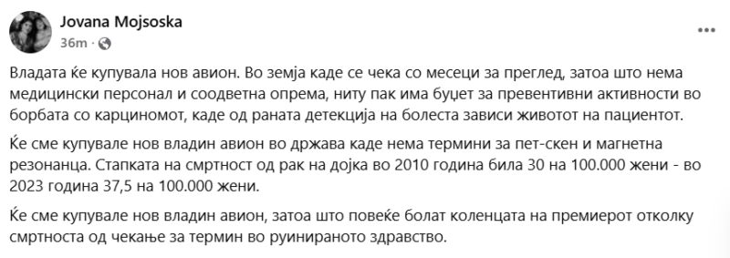 Пратеничката од партијата Левица, Јована Мојсоска, на својот Фејсбук профил реагираше против најавите на Владата за купување на нов владин авион, нагласувајќи ја „катастрофалната состојба во македонското здравство каде луѓето умираат чекајќи термини за преглед“.