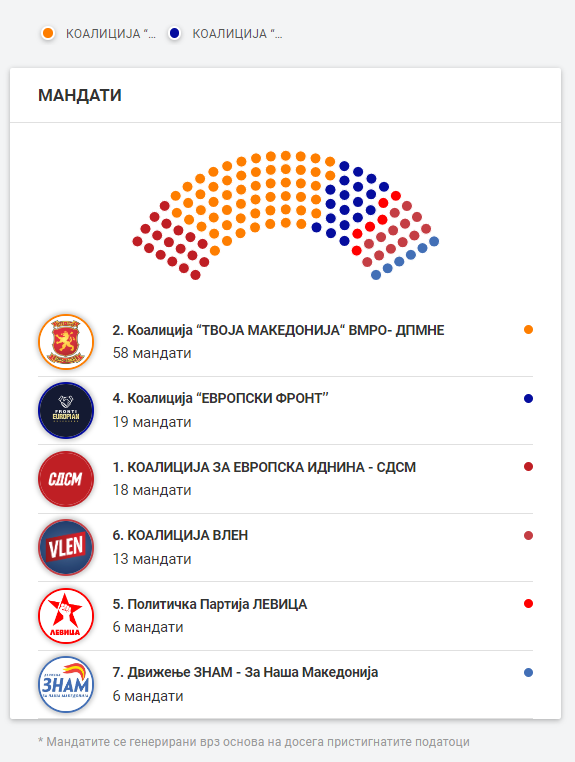 Со последните прсметки, ВМРО-ДПМНЕ на изборите освои 58 пратенички мандати, ДУИ-19, СДСМ-18, ВЛЕН-13, и Левица и ЗНАМ по шест.