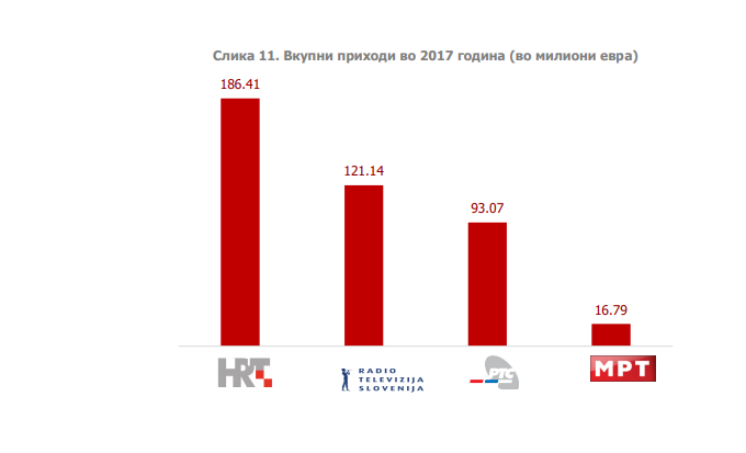 Во 2017 година, за остварување на функцијата на јавен радиодифузен сервис, ХРТ располагала со 11 пати повеќе средства од МРТ, ТВСЛО со седум пати повеќе, а РТС со пет и пол пати повеќе средства отколку МРТ.