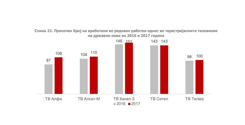 Во структурата на приходите, најзначајно учество имале приходите од продажба на времето за рекламирање (87,10%). Во 2017 година, просечниот број на вработени во редовен работен однос кај овие пет телевизии бил 612 лица. Од нив најмногу вработени биле во ТВ Канал 5 (151 лице).