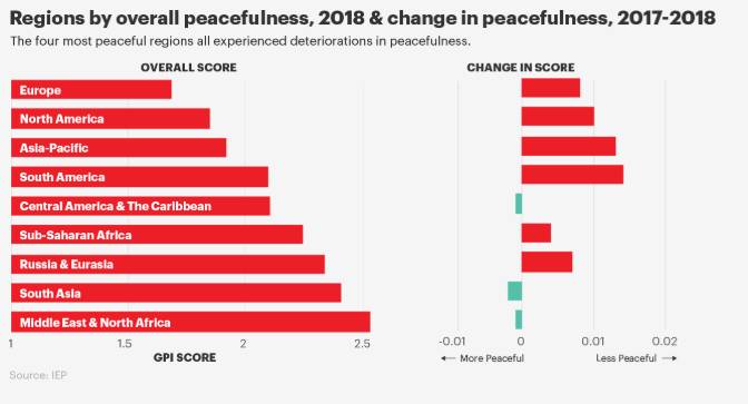 Најновиот Глобален мировен индекс покажува дека лани мирот се влошил во 92 земји во светот, додека 71 држава забележале подобрување. Светскиот мир е на најниско ниво во последниве години, а индексот покажува свет во кој тензиите, конфликтите и кризите кои се појавиле последнава деценија, остануваат нерешени, особено на Блискиот Исток и резултираат со постепено и постојано опаѓање на состојбата на мир. Од вкупно девет светски региони за кои се вршени испитувања во Институтот за економија и мир, Европа е најмирољубива. Од првопласираните најмирољубиви земји во светот освен Нов Зеланд, останатите се наоѓаат во Европа: Исланд, Австрија, Португалија и Данска. Германија и натаму останува на 17. позиција.