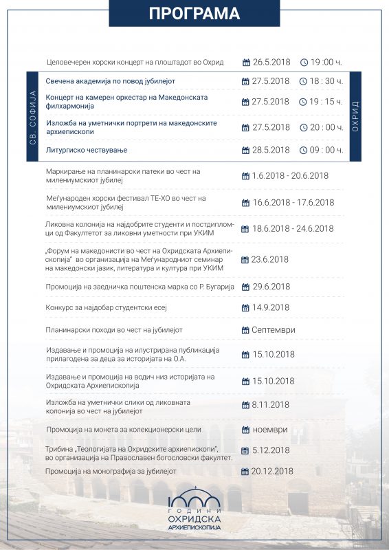 Тие ги поканија граѓаните од целата држава да го посетат градот Охрид за време на централната свеченост и да бидат дел од одбележувањето на милениумскиот јубилеј. На 27 мај во катедралниот храм на охридските архиепископи „Света Софија“ ќе се одржи свечена академија под покровителство на претседателот на Република Македонија, Ѓорге Иванов, а пригодни обраќања ќе има државниот и црковниот врв. Вечерта ќе се одржи и свечен концерт на Камерниот оркестар на Македонската филхармонија. На 28 мај во храмот „Св. Софија“ со почеток во 9 часот ќе почне литургиското чествување, чиноначалствувано од архиепископот охридски и македонски г. г. Стефан, во сослужение на членовите на САС на МПЦ-ОА, свештенството и монаштвото. Градот Охрид програмата ја надополнува и со културни настани, кои ќе се случуваат во периодот од 24 мај до 28 мај во центарот на Охрид.