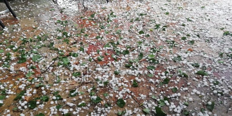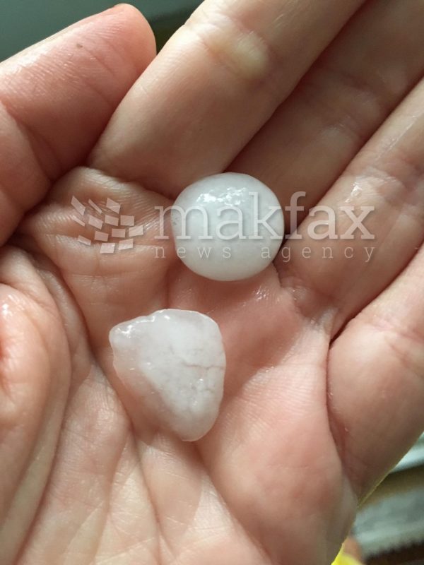 Силно невреме со пороен дожд, грмежи и град го зафати попладнево Скопје. Улиците побелеа од градот што паѓаше, а беше со големина на орев.