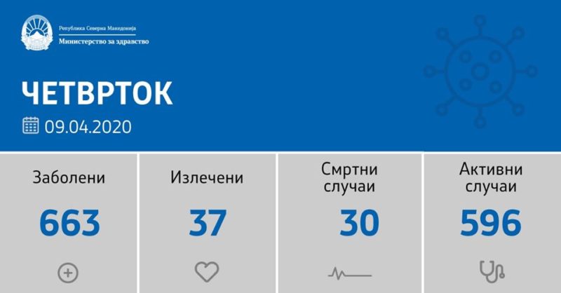 Со ова вкупната бројка на дијагностицирани пациенти со Ковид-19 во нашата земја изнесува 663 лица. Според местото на живеење, досега случаи на Ковид -19 се регистрирани во: