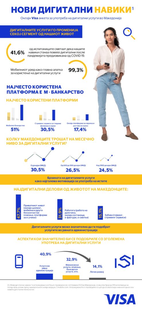Според најновата анкета на Visa „Нови дигитални навики“1, четворица од десет Македонци наведуваат дека нивните навики станале подигитални или се претежно дигитални, како резултат на пандемијата (41 отсто и 38 отсто соодветно). Виртуелните услуги го сменија секој сегмент од нашите животи. За половина од испитаниците, приватното време е најдигиталниот аспект од нивниот живот. Една третина велат дека е работата, а за 15 отсто одговорот е забава, поради големото време поминато на останатите стриминг платформи, а само 5 отсто ја користат за здравје, што подразбира закажување вакцинации и лекарски прегледи, онлајн обуки или следење на здравјето преку апликација.