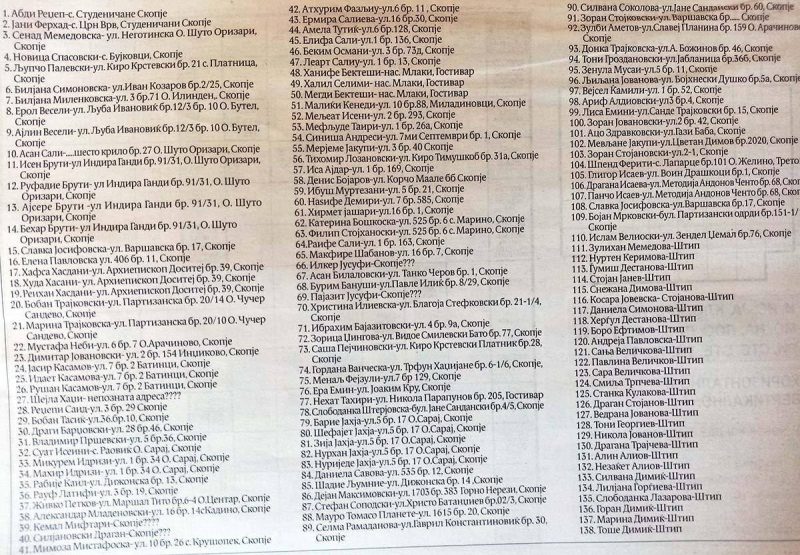 Објавени се имињата на 138 лица кои по разни основи не примиле решение за изолација, проблем со кој се соочува Државниот санитарен и здравствен инспекторат во текот на пандемијата. Според списокот, најбројни се жители на Скопје, односно, 104 од нив одбиле да примат решение, оставајќи погрешна или лажна адреса. Потоа, следува Штип со 28 жители и Гостивар со четири жители. Сите се објавени во дневниот печат после повеќе обиди да им биде доставено решението изготвено од инспекторатот.