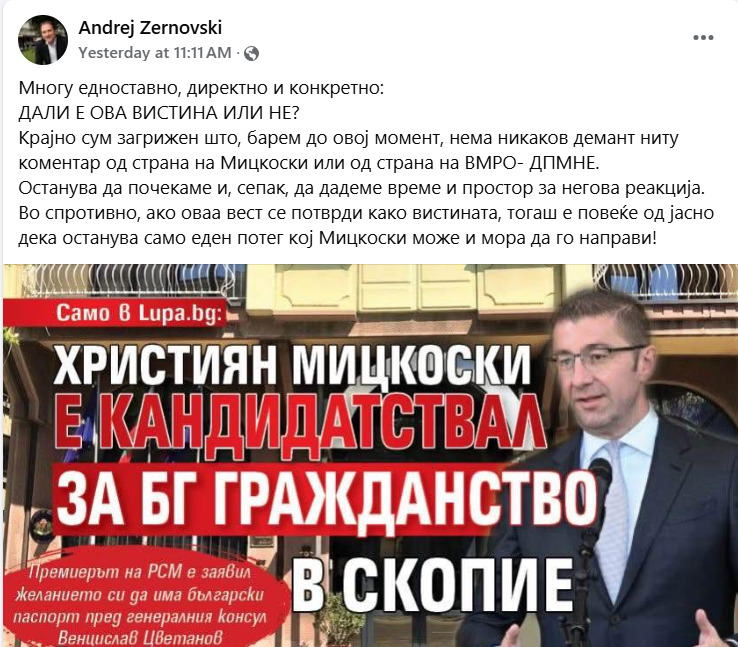 Претходно Андреј Жерновски преку објава на социјалните мрежи побара одговор од премиерот Мицкоски дали аплицирал за бугарско државјанство.