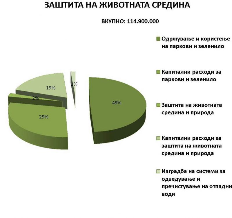 Во делот на заштита на животната средина, предвидени се субвенции за печки на пелети, за чистење оџаци, за велосипеди и за инвертер клима-уреди, набавка на мерачи за испитување на квалитетот на воздухот, како и проект за собирни центри за селектирање отпад. Но сепак, приоритет ќе се стави на подигнувањето нови површини со зеленило, и тоа преку изградба на четири нови парка и реконструкција на два постојни, како и натамошно садење нови високостеблести дрвја.