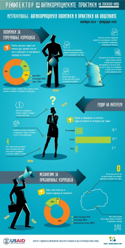 „НВО инфоцентарот“, во рамките на проектот „Рефлектор врз антикорупциските практики на локално ниво“, финансиски поддржан од УСАИД, спроведе истражување/мапирање на политиките, механизмите и практиките за борба против корупцијата на општините во Република Северна Македонија. Ова истражување ги опфати сите општини, како и Град Скопје. До сите општини и Град Скопје беа доставени барања за пристап до информации од јавен карактер. Одговори и документи доставија вкупно 68 или 84 отсто од вкупниот број општини во државата.