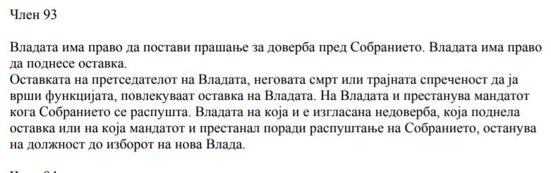 Во членот од Уставот, меѓудругото се наведува: Оставката на претседателот на Владата, неговата смрт или трајната спреченост да ја врши функцијата, повлекуваат оставка на Владата. На Владата и престанува мандатот кога Собранието се распушта.