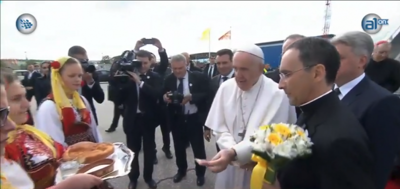 Папата Франциско пречекан со леб и сол на аеродромот во Скопје