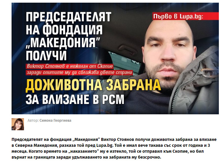„На претседателот на бугарската фондација „Македонија“, Виктор Стојанов, изречена му е доживотна забрана за влез во Македонија, Ова го потврди тој за порталот „Лупа.бг“. Тој веќе имаше забрана од една година и 3 месеци. Кога му завршила забраната, се упатил кон Скопје, но бил вратен назад на граница бидејќи таа му била продолжена на неодредено време.