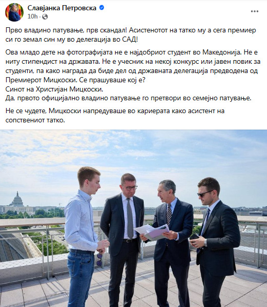 „Прво владино патување, прв скандал! Асистенотот на татко му а сега премиер си го земал син му во делегација во САД! Ова младо дете на фотографијата не е најдобриот студент во Македонија. Не е ниту стипендист на државата. Не е учесник на некој конкурс или јавен повик за студенти, па како награда да биде дел од државната делегација предводена од Премиерот Мицкоски. Се прашуваше кој е? Синот на Христијан Мицкоски. Да, првото официјално владино патување го претвори во семејно патување. Не се чудете, Мицкоски напредуваше во кариерата како асистент на сопствениот татко“, објави на „Фејсбук“ Петровска.