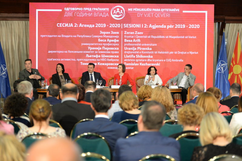 На вториот панел дискусија од Форумот посветен на Две години Влада – Одговорно пред граѓаните се дебатираше за фокусот и приоритетите на Владата до крајот на мандатот за периодот 2019-2020. Овој панел беше отворен со воведно обраќање на премиерот Заев, а потоа во дебатата се вклучија и новинарот, Томислав Кежаровски, универзитетската професорка, Беса Арифи, граѓанска активистка и претседателка на НВО Амбрела, Љатифа Шиковска, директорката на Хелсиншкиот комитет за човекови права, Уранија Пировска и извршниот директор на ЦИВИЛ, Џабир Дерала како модератор на вториот панел дискусија.