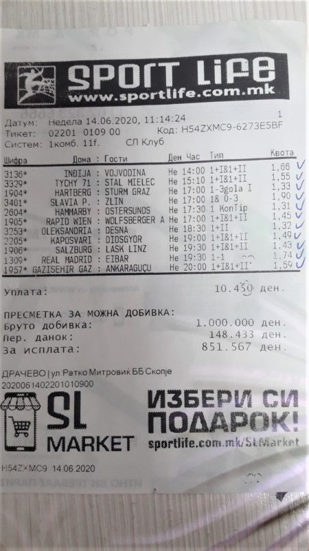 Искористувајќи ја зголемената понуда на фудбалски натпревари, се обложил на мечеви од шампионатите во Србија, Австрија, Чешка, Турција, Украина, Шведска. Повеќето парови ги типувал со играта да има најмалку по еден гол во двете полувремиња и тактиката се покажала успешна. Возбудата за нашиот играч започнала уште во 14 ч. со мечот на Инџија против Војводина, а со победата на Реал против Еибар, како и онаа на Салцбург против ЛАСК, милионот бил на повидок за обложувачот од Драчево.