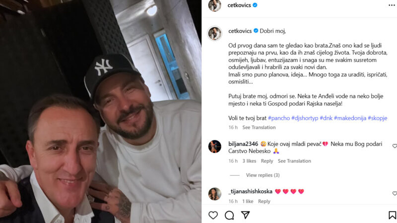 „Од првиот ден те гледав како брат. Знаеш кога луѓето се препознаваат на прв поглед како да ги познаваш цел живот. Твојата љубезност, насмевка, љубов, ентузијазам и сила ме воодушевуваа на секоја средба и ме охрабруваа за секој нов ден“, напиша црногорскоот пејач Сергеј Ќетковиќ на социјалните мрежи.