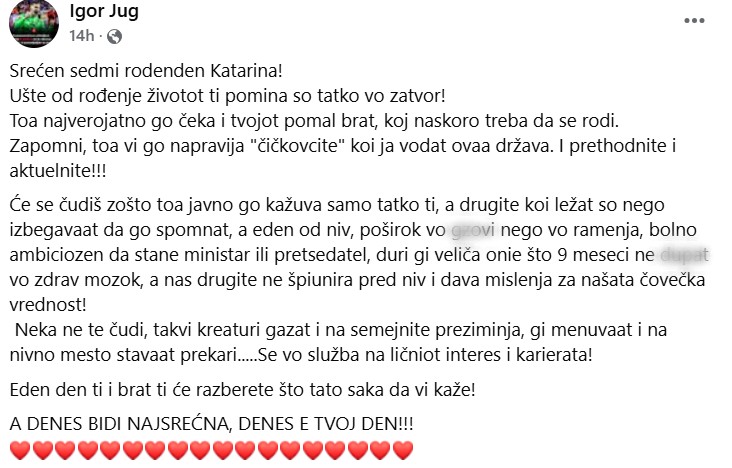 Последната објава на Игор Југ посветена на ќерка му: Животот ти помина со татко во затвор, а тоа го чека и твојот брат, кој набргу треба да се роди
