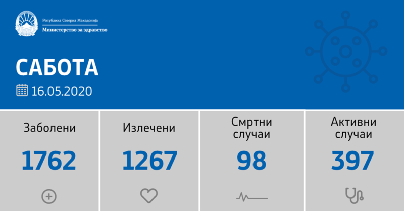 Вкупната бројка на ковид дијагностицирани во нашата земја од почетокот на епидемијата изнесува 1.762, бројката на оздравени пациенти е 1.267, на починати е 98, а во моментов бројот на активни случаи во земјата изнесува 397.