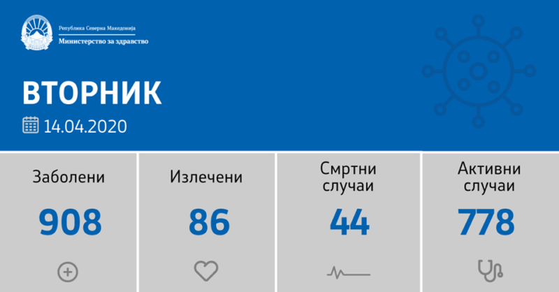 Со ова вкупната бројка на дијагностицирани пациенти со Ковид-19 во нашата земја изнесува 908 лица. Според местото на живеење, досега се регистрирани во: