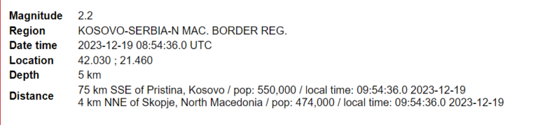 Телеметриската сеизмолошка мрежа на Република Северна Македонија, на сеизмолошките станици инсталирани ширум нашата територија, одржувани од Сеизмолошката опсерваторија при Природно-математичкиот факултет во Скопје, денес во 09 часот и 54 минути, регистрираше земјотрес чиj епицентар припаѓа на Скопското епицентрално подрачје, со Рихтерова локална магнитуда ML2.3.