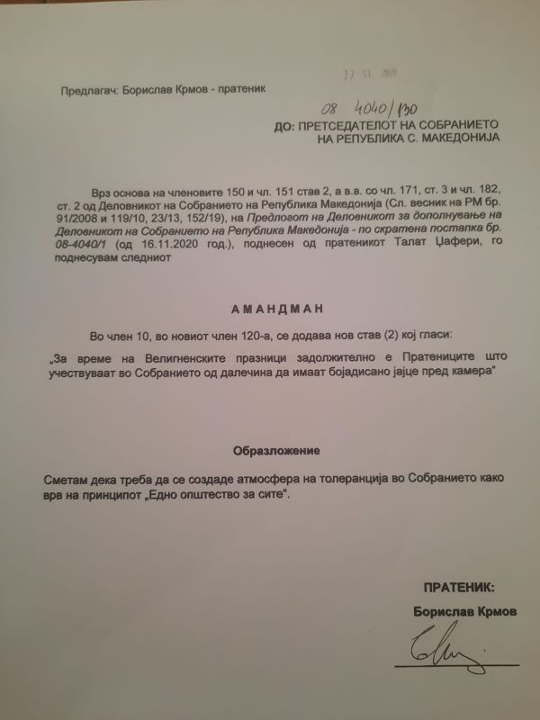 Во еден од амандманите на опозицијата се вели дека за време на велигденските празници, пратениците кои ќе учествуваат во работата на Собранието од далечина, треба да имаат бојадисано јајце пред камера. Ова го истакна на прес-конференција, Јован Митрески, координатор на пратеничка група на СДСМ и коалицијата.