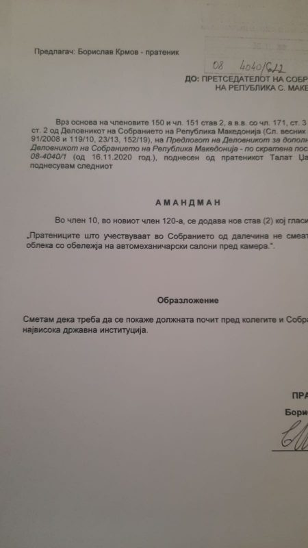 Понатаму, тој вели дека во дел од амандманите се бара пратениците кои учествуваат во работата од далечина да не смеат да носат облека со обележја на автомеханичарски салони и месарници, да не смеат да носат џемпери затоа што, тоа било навреда за Собранието..
