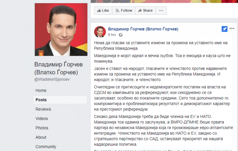„Нема да гласам за уставните измени за промена на уставното име на Република Македонија. Македонија е мојот идеал и вечна љубов. Тоа е емоција и кауза што не поминува. Јасен е ставот на народот, гласачите и членството против најавените измени за промена на уставното име на Република Македонија. И народот, и гласачите, и членството. Очигледни се притисоците и недемократските постапки на власта на СДСМ во кампањата за референдумот, кои секојдневно се засилуваат, особено во локалните средини. Сето тоа дополнително го компромитира и проблематизира резултатот и демократскиот карактер на претстојниот референдум. Секако дека Македонија треба да биде членка на ЕУ и НАТО. Македонија тоа одамна го заслужува, а ВМРО-ДПМНЕ беше првата партија во независна Македонија која ги промовираше евро-атлантските интеграции. Членството на Македонија во НАТО и ЕУ, заедно со стратешкото партнерство со САД, остануваат приоритет на нашата надворешна политика“, напиша Ѓорчев.