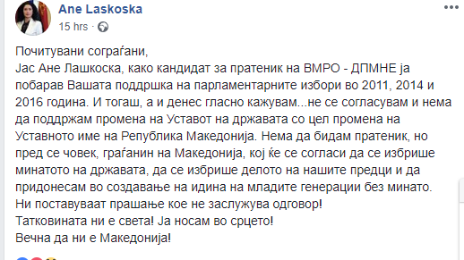 „Јас, Ане Лашкоска, како кандидат за пратеник на ВМРО–ДПМНЕ ја побарав вашата поддршка на парламентарните избори во 2011, 2014 и 2016 година. И тогаш, а и денес гласно кажувам, не се согласувам и нема да поддржам промена на Уставот на државата со цел промена на уставното име на Република Македонија. Нема да бидам пратеник, но пред сѐ човек, граѓанин на Македонија, кој ќе се согласи да се избрише минатото на државата, да се избрише делото на нашите предци и да придонесам во создавање иднина на младите генерации без минато. Ни поставуваат прашање што не заслужува одговор! Татковината ни е света! Ја носам во срцето! Вечна да ни е Македонија!“, напиша Лашкоска.