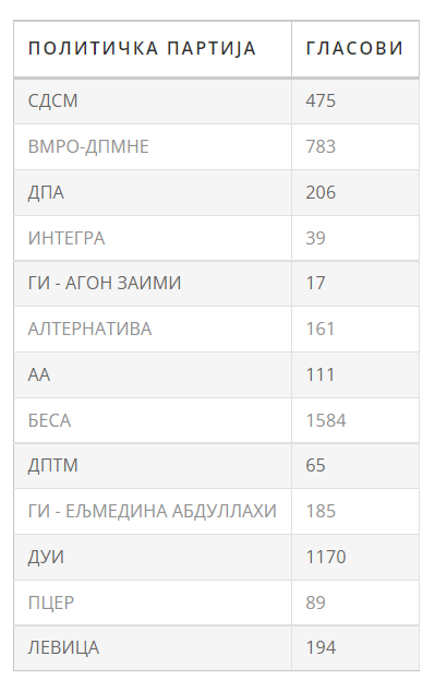Според досега пребројаните гласови, ВМРО-ДПМНЕ освоиле 783 гласа, наспроти 475 на СДСМ.