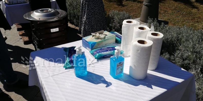 На вратата се залепени информативните плакати на Министерството за здравство во однос на превенција и заштита од ковид-19, столчињата за новинарите се поставени на раздалеченост од еден метар, а поставена е и маса на која има гелови за дезинфекција на раце, влажни марамчиња и нараквици.