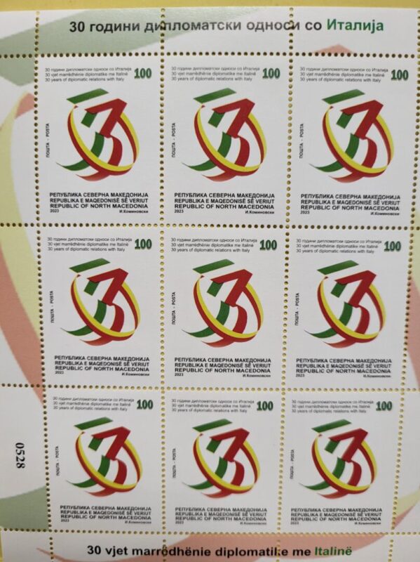 Денес во Скопје беше промовирана поштенската марка по повод 30-годишнината од воспоставувањето на дипломатските односи меѓу Италија и Северна Македонија, издадена од А.Д. Пошта на Северна Македонија, на иницијатива на Амбасадата на Италија во Скопје, благодарение и на поддршката од македонското Министерство за надворешни работи.