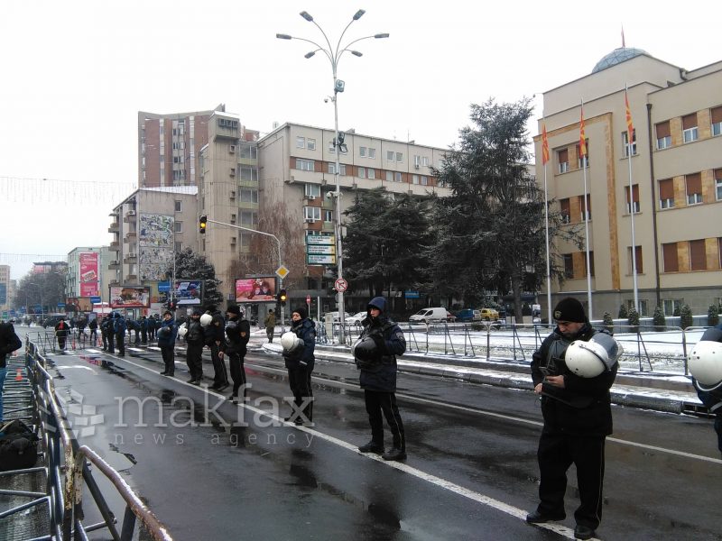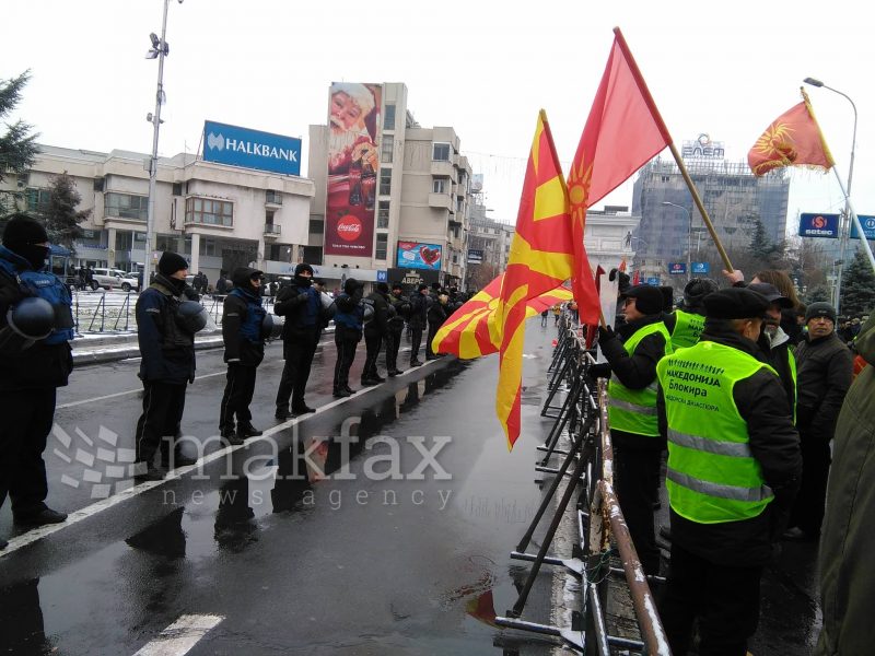 ,,Македонија – блокира” под засилно полициско обезбедување го започна протестот пред Собрание, каде што пратениците ја започнаа финалната фаза за усвојување на уставните измени. Тие извикуваат ,,предавници”, ,,издаици”, ,,платеници “, ,,Македонија, Македонија” и ги повикуваат пратениците и претседателот Ѓорге Иванов да им се придружат на големиот протест и да се спротивстават на промената на името. Тие бараат да влезат во Собрание, и го повикуваат претседателот да прогласи воена состојба.