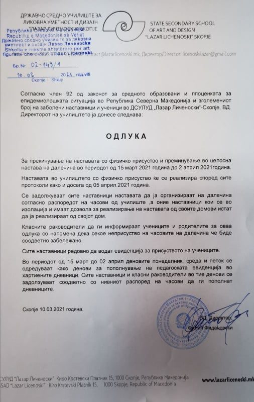Во документот се соопштува дека наставата со физичко присуство се прекунува од 15 март до 2 април. Наведено е дека ваквата одлука се должи на зголемениот број заразени наставници и ученици во училиштето.