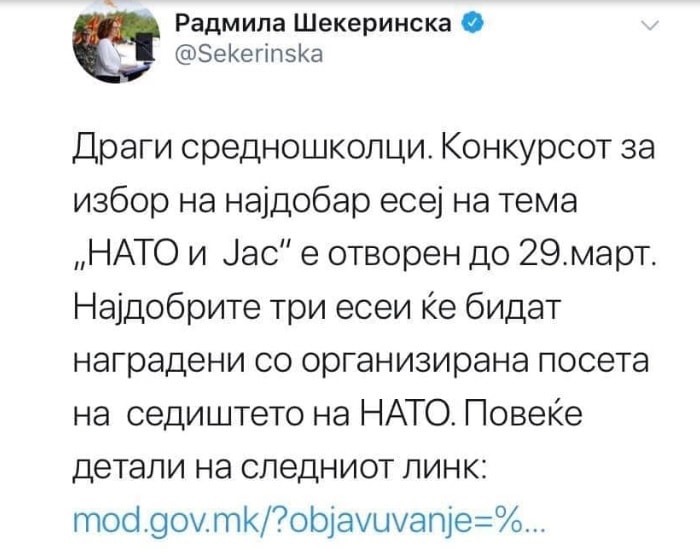 „Министерката за одбрана, Радмила Шекеринска, ги повикува учениците да се вклучат во пишувањето на есеи преку својот фејсбук-профил притоа не потенцирајќи дали да пишуваат за последиците или за причините за формирање, за позитивните ефекти или негативните или, пак, за статистиките на загинати деца во конфликтите во кои учествувала алијансата? Можеби се работи за тема која ќе ја разбуди емпатијата кај средношколците и би пишувале за децата чии родители загинале во воените конфликти и животот по загубата на родител, или, пак, за животот на родители по загубата на дете во еден таков воен конфликт од кој НАТО било дел.Првата детска амбасада во светот ‘Меѓаши’ ги повикува и поттикнува учениците кои решиле да конкурираат на овој конкурс добро да се запознаат со НАТО-алијансaта, со сите негативни импликации, да ги согледаат поготово последиците и да се обидат да ги почуствуваат болката и тагата од војната и да ги пресликаат тие чувства на есеите со кои ќе аплицираат. Бидејќи ние сме луѓе, а луѓето треба меѓусебно да се почитуваат, сакаат и разбираат“, порачуваат од првата детска амбасада.