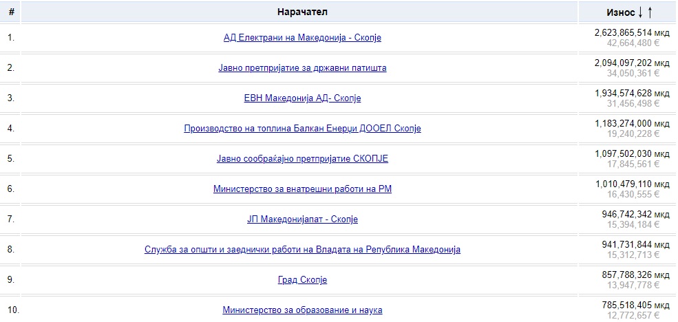 АД ЕЛЕМ е на врвот на листата како нарачател на тендери – само годинава биле распишани јавни огласи за сума од над 40 милиони евра. Веднаш за АД ЕЛЕМ е ЈП претпријатие за државни патишта, а потоа следува ЕВН.