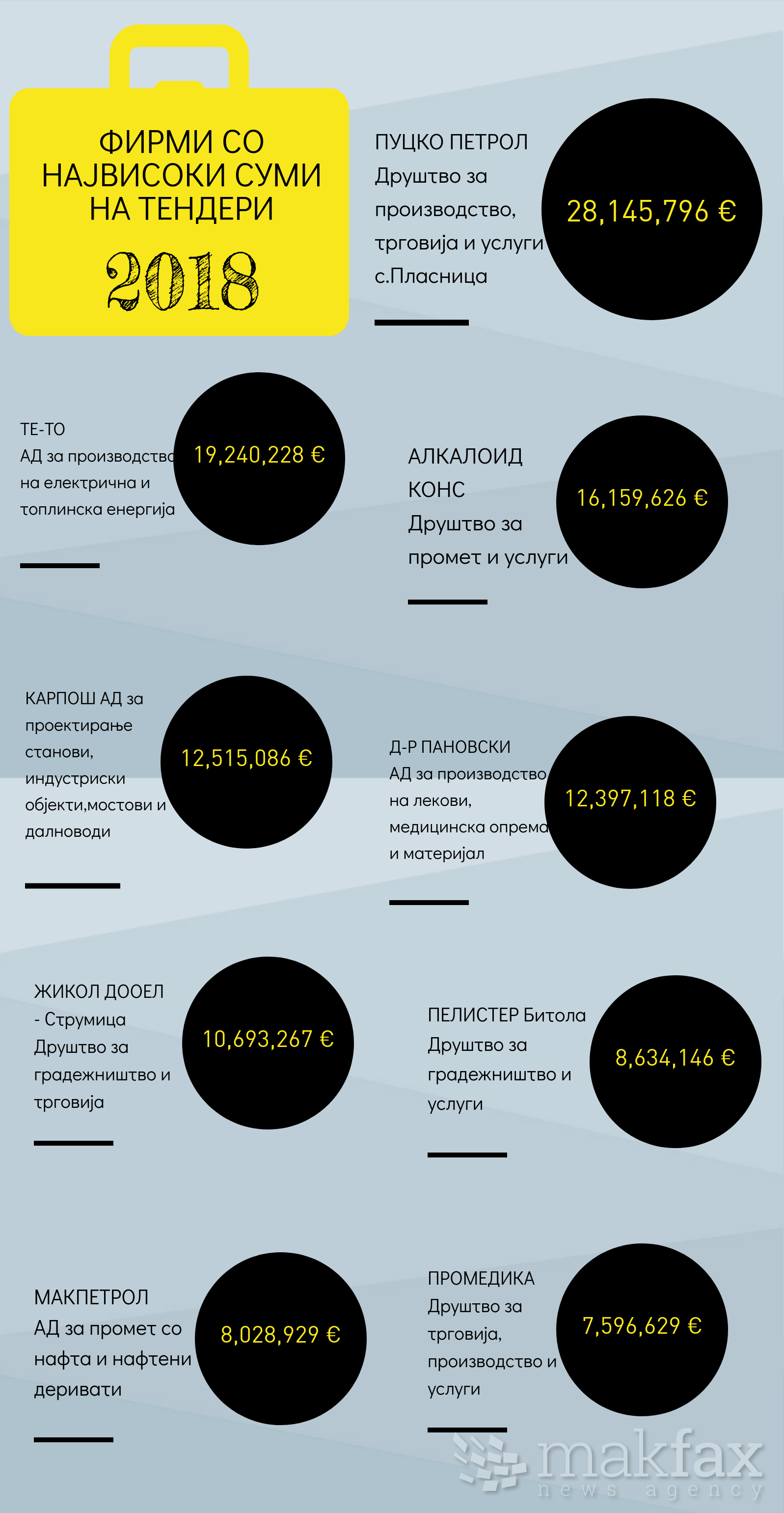 Градежни фирми, фирми за медицинска опрема и лекови и добропознатата „Пуцко Петрол“ за нафтени деривати се на врвот на листата на компании кои годинава добивале тендери од државата.