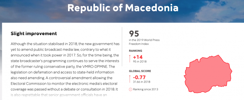 Главна забелешка на Репортери без граници е состојбата во јавниот сервис, МРТВ, каде владата сѐ уште не спровела реформи. „Иако ситуацијата се стабилизираше во 2018, новата влада сѐ уште не го изменила Законот за јавниот радиодифузер, спротивно на она што го најавуваше во 2017“, забележува организацијата.