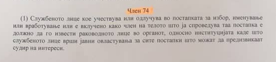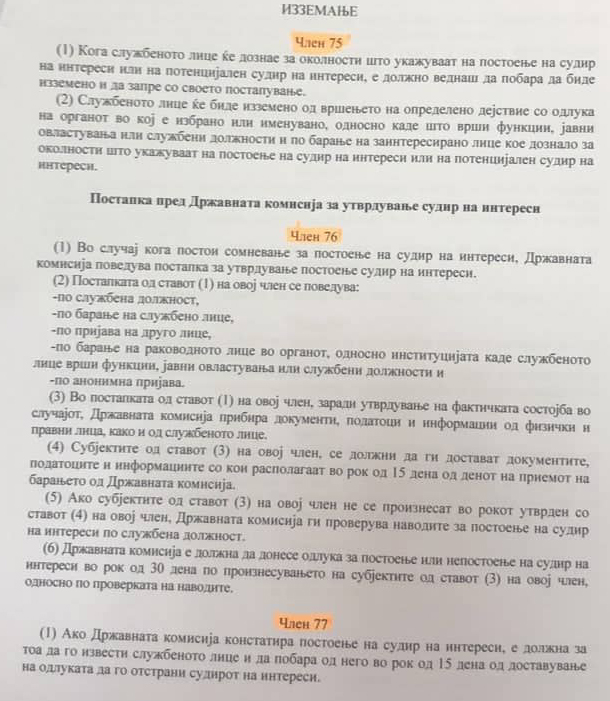 „Службеното лице ќе биде изземено од вршењето определено дејство со одлука на органот во кој е избрано или именувано, односно каде што ќе врши функции, јавни овластувања или службени должности и по барање на заинтересирано лице што дознало за околности што укажуваат на постоење на судир на интереси или на потенцијален судир на интереси.